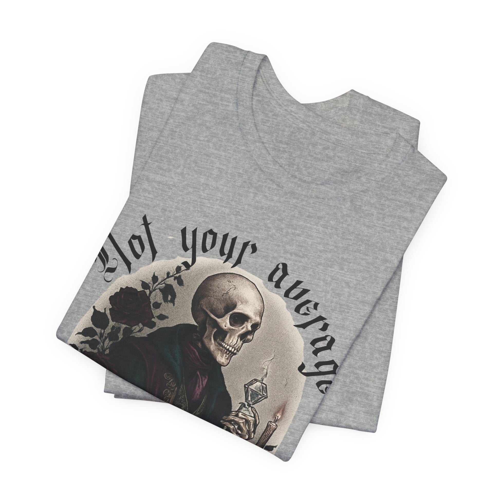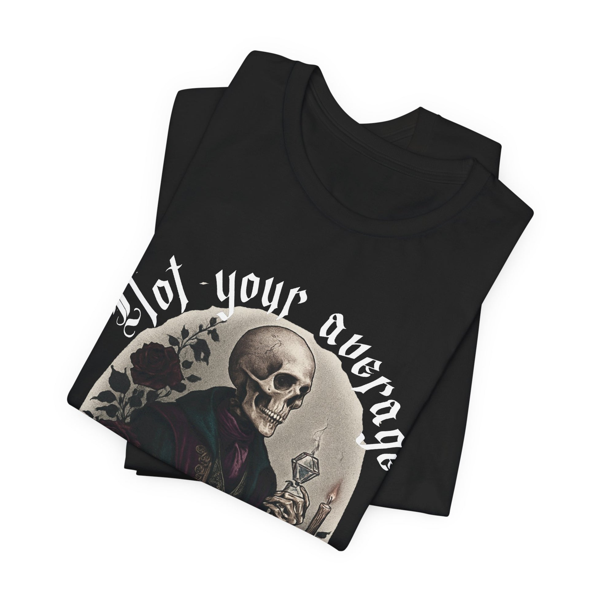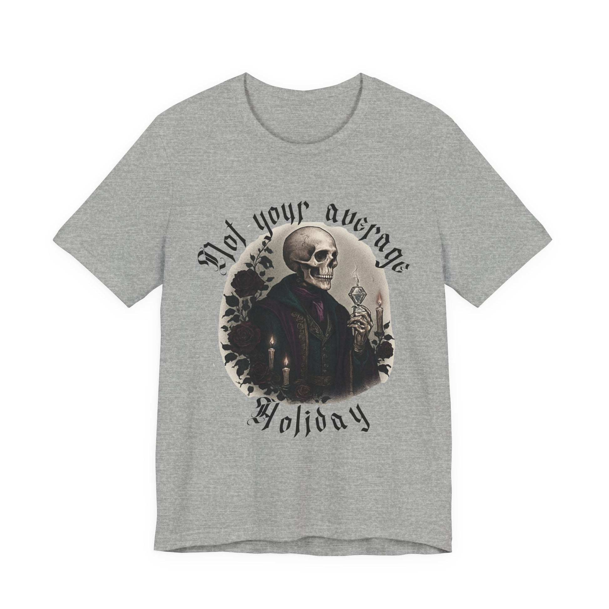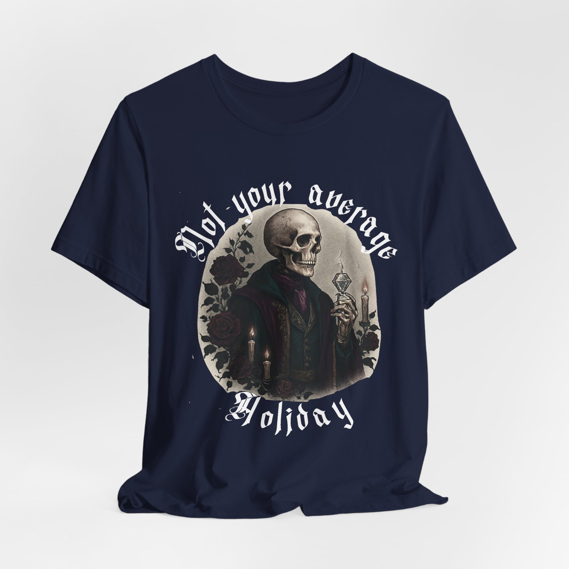This lightweight tee carries a quiet, dark charm: a vintage-inspired portrait of a dapper skeleton framed by florals and the bold declaration: NOT YOUR AVERAGE HOLIDAY.