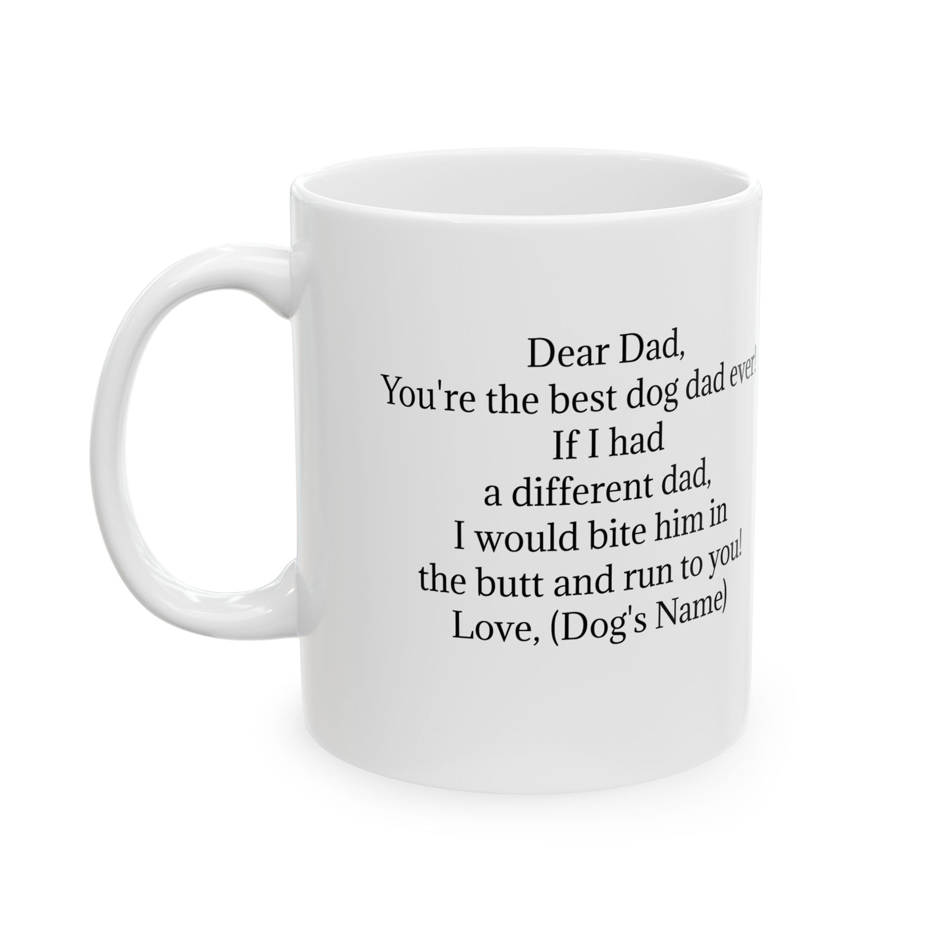 Show your appreciation with our premium "Best Dog Dad Ever" ceramic coffee mug - the perfect gift for dog lovers! This durable, dishwasher-safe mug features stylish dog-themed graphics and can be personalized with your pup's name. Available in either 11- or 15-oz sizes to match any dog dad's style. Makes a thoughtful Father's Day, birthday, or holiday gift that combines practicality with heartfelt sentiment.